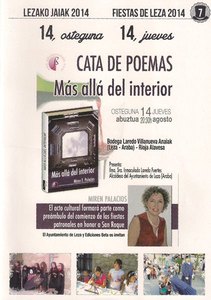 Firma de MÁS ALLÁ DEL INTERIOR en BODEGA LAREDO VILLANUEVA ANAIAK (2014-08-14)La cata de poemas “Más allá del interior” en Leza (Araba), se desarrollo en tres partes: