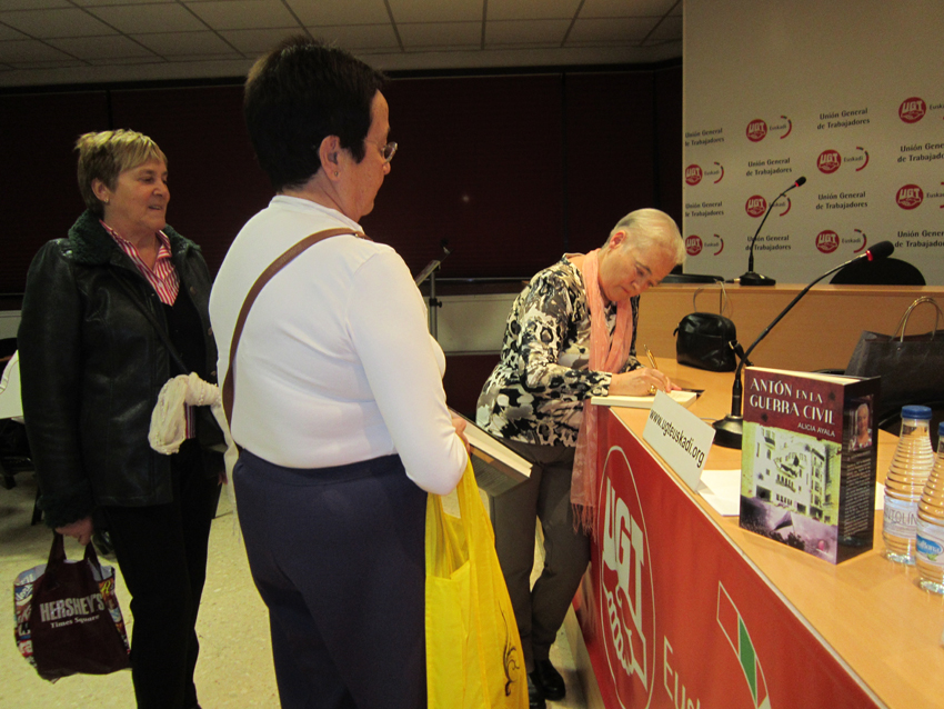 Presentacion de ANTÓN EN LA GUERRA CIVIL en UGT Sede Central de Bilbao (2013-11-14)La autora recibió al numeroso público que se congregó en el salón de actos de la sede de la UGT en Bilbao. Alicia Ayala presentaba su primera novela: Antón en la Guerra Civil.