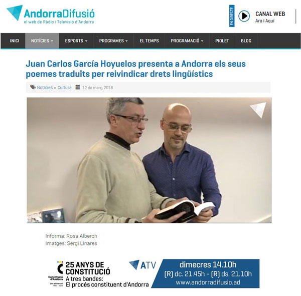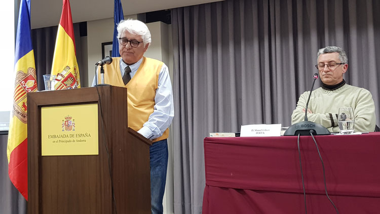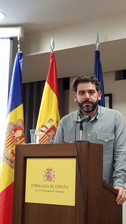 En primer lugar, mi agradecimiento a la Embajada de España en Andorra, a Manuel Montobbio, su Embajador, al poeta Manel Gibert por gestionar la presentación, a cuantos intervinieron dando voz a los poemas recitados (Carlos Figueiredo, David Gálvez Casellas, Joan Peruga y Alfons Valdés), al público que tuvo la amabilidad de acompañarnos y a la prensa y televisión andorrana por la generosa difusión de este proyecto poético-musical ibérico.