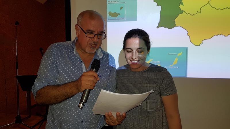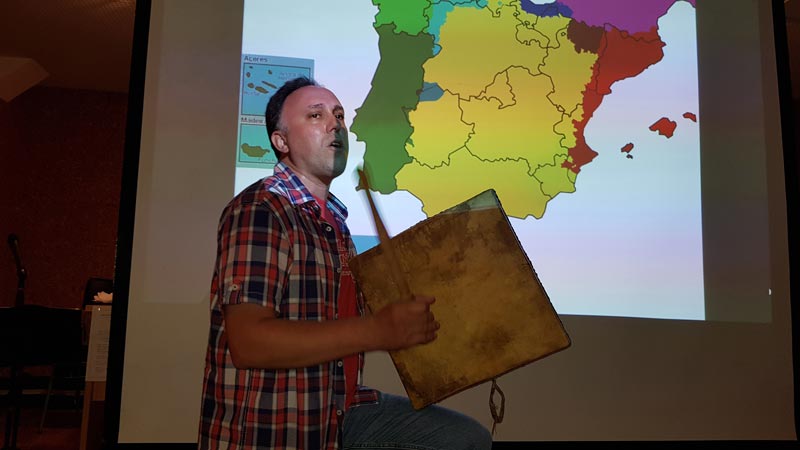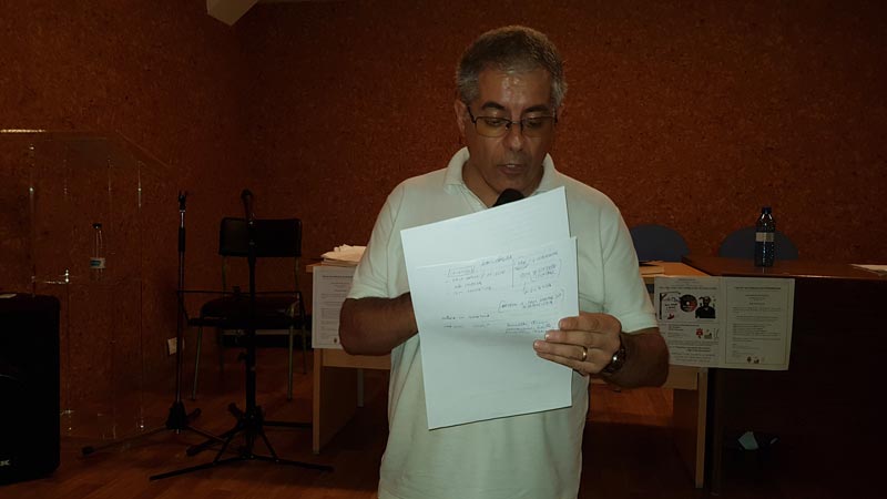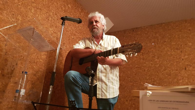 Acabada la primera parte de esta jornada, a las 20:00 horas esperaba el turno la presentación de "Aire, fuego y deseo", proyecto poético-musical ibérico que ha impulsado, con la colaboración del Ayuntamiento de Sa Martín de Trevellu, OSCEC Estremaúra y Além Guadiana, la celebración de esta primera cita de las lenguas extremeñas. Para mí ha sido un honor que recordaré toda mi vida. Gracias a los que participaron recitando en la presentación, como Francisco José Antúnez Naváis, Carlos Castilho Pais, Miguel Ángel Gómez Naharro, Bienvenido Gutierro Rodríguez Juan Carlos Márquez Durán, José Benito Mateos Pascual, Mai Payo Barroso y Juan Francisco Reina Raposo. Gracias a Manuel Trinidad, Juan Carlos Márquez Durán y Daniel Gordo, encargados de presentarme. Fantásticas interpretaciones musicales en directo de Txebe Benito, Miguel Ángel Gómez Naharro y Trinidad Rivas, cantautora xalimega que fue candidata a ser "Extremeño del Año 2016" por el tema "Misturaixi entre o fogu i a noiti", primera canción pop en a fala y que está incluida en el CD de "Aire, fuego y deseo". Entre otros temas musicales, se proyectó "En el destierru del mi silenciu", interpretado por Manuela Elena y que también fue la primera canción pop en extremeño. Imposible olvidar a Antonio Corredera, su contribución en este proyecto poético-musical, concretamente por "a fala", fue vital, una muestra de generosidad digna de mencionar. Asimismo, a Aída Acosta y Manuela Elena, que por motivos laborales no pudieron participar; os echamos de menos.
