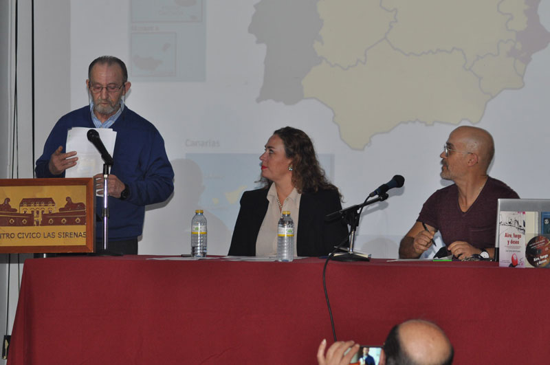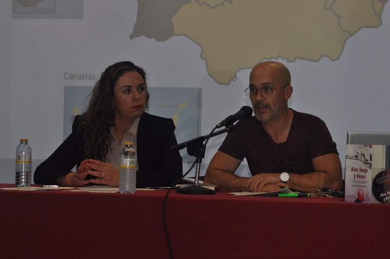 Presentacion de AIRE, FUEGO Y DESEO (3ª ED.) en Salón de Actos del Centro Cívico Las Sirenas (2019-11-26)En un día lluvioso, con txirimiri, más propio de la ciudad de Bilbao, Juan Carlos García Hoyuelos presentó el 26 de noviembre el proyecto poético-musical ibérico "Aire, fuego y deseo" en el Centro Cívico Las Sirenas de Sevilla, una hermosa casa-palacio del siglo XIX. Carmen Cayetana Castro Moreno, escritora y profesora de Filología Alemana en la Universidad de Sevilla, fue quien presentó al poeta burgalés. Además de proyectarse vídeo-clips de canciones incluidas en el CD de "Aire, fuego y deseo", se recitaron varios poemas del libro en las voces del poeta Francisco Espejo Álvarez, José María Calvo López, la mencionada Carmen Cayetana Castro Moreno y Blanca del Río Capellán, quien declamó en leonés.
