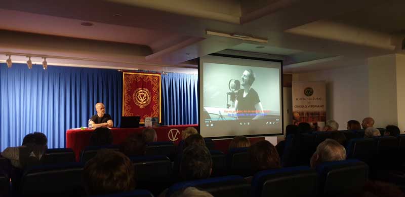 Era una tarde de carnaval, domingo, con una temperatura exterior que invitaba más a estar en la calle que acudir a un recital, pero aun así muchas personas se acercaron al Círculo Vitoriano, a las 19:00 horas, para presenciar la presentación del proyecto poético-musical "Aire, fuego y deseo". La misma Carmen Villahizán fue la encargada de presentarme al respetable. Durante una hora y media se alternaron las declamaciones por un elenco de artistas con vídeo-clips musicales y la magnífica actuación musical en directo del cantautor alavés Santxo. Todos los que recitaron estuvieron bárbaros, perfectos, una delicia para los que les escuchábamos; la bertsolari Oihane Perea recitó dos poemas de "Aire, fuego y deseo" traducidos al euskera, mientras que en castellano lo hicieron María José Martín, Aurora Nieva, Ángel de Lucas, Marisol Barguilla, Luis Lagos y María Pilar Vicente. Mi cometido fue, una vez saludé en euskera y castellano, presentar a las personas citadas y explicar en qué consiste "Aire, fuego y deseo", cuáles son las lenguas relacionadas en el poemario y el periplo que ha recorrido este proyecto poético-musical hasta hacerse realidad, así como los reconocimientos que ha ido cosechando, no solo su autor sino también, y para mí más importante, las personas que han colaborado en él.
