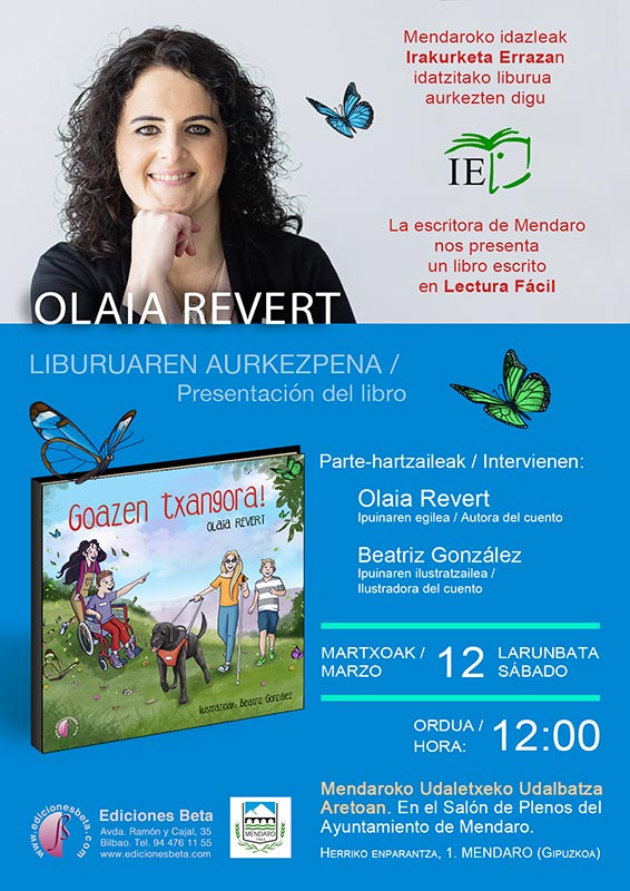 Presentacion de GOAZEN TXANGORA! en Mendaroko udaletxea (Udalbatza Aretoa) (2022-03-12)Olaia Revert-ek, idazlaria, Goazen txangora! ipuina aurkeztu zuen Mendaroko udaletxean. Udalbatza Aretoa. Mendaro (Gipuzkoa).
