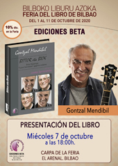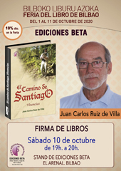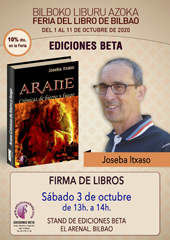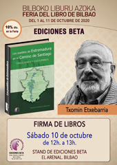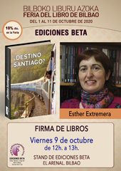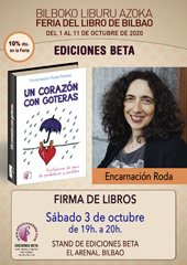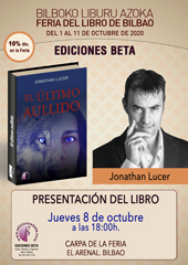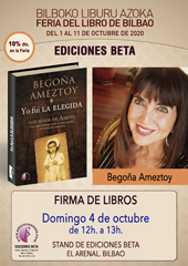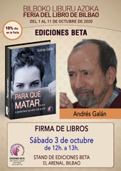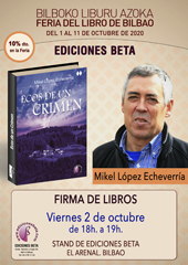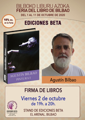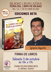 | 50 edición de la Feria del Libro de Bilbao, desde el jueves 1 al domingo 11 de octubre de 2020. EDICIONES BETA, como en años anteriores, estará presente con estand propio, donde encontrarás todas nuestras novedades del último año y en él estarán nuestros autores firmando ejemplares de sus libros. Las presentaciones de libros serán en la carpa central de la feria. Horario de la Feria: de 11:00 a 14:00 h. y de 17:00 a 20:00 h. (10% de descuento en feria).
