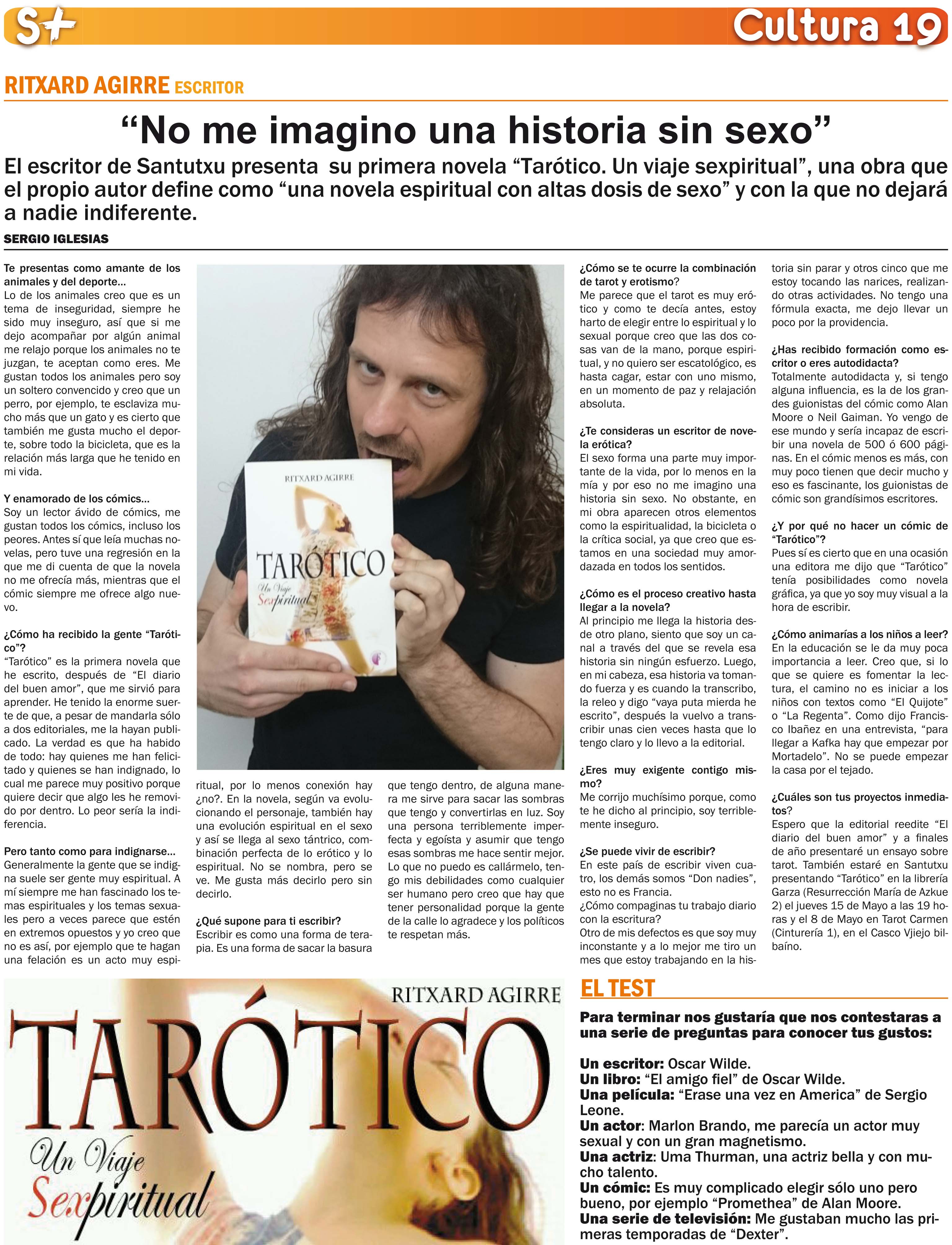 "Tarótico. Un viaje sexpiritual, tenía que ser escrito por alguien y me ha tocado a mí". Es una de las frases que destaco, de las muchas que he apuntado en mi libreta, de la conversación con Ritxard Agirre. Autor de esta novela erótica con alma, con referencias continuas a su tierra y muy personal. Santutxutarra, amante de la bicicleta e inmerso en el mundo del Tarot y de todo lo que conlleva, nos ofrece un texto irreverente, con magia y que engancha.