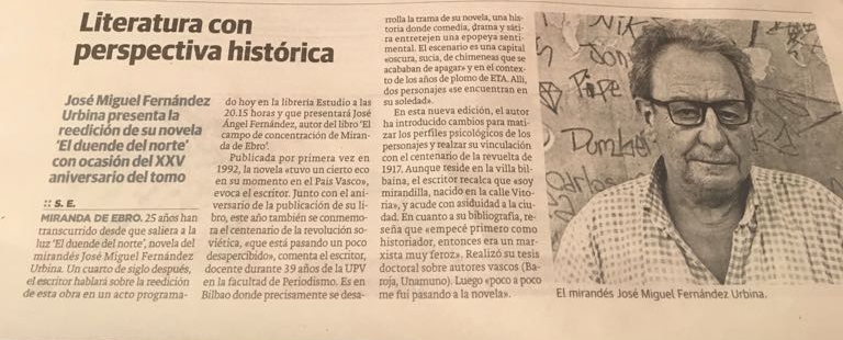 03.11.2017. "Literatura con perspectiva histórica. José Miguel Férnandez Urbina presenta la reedición de su novela El duende del Norte con ocasión del XXV aniversario del tomo".