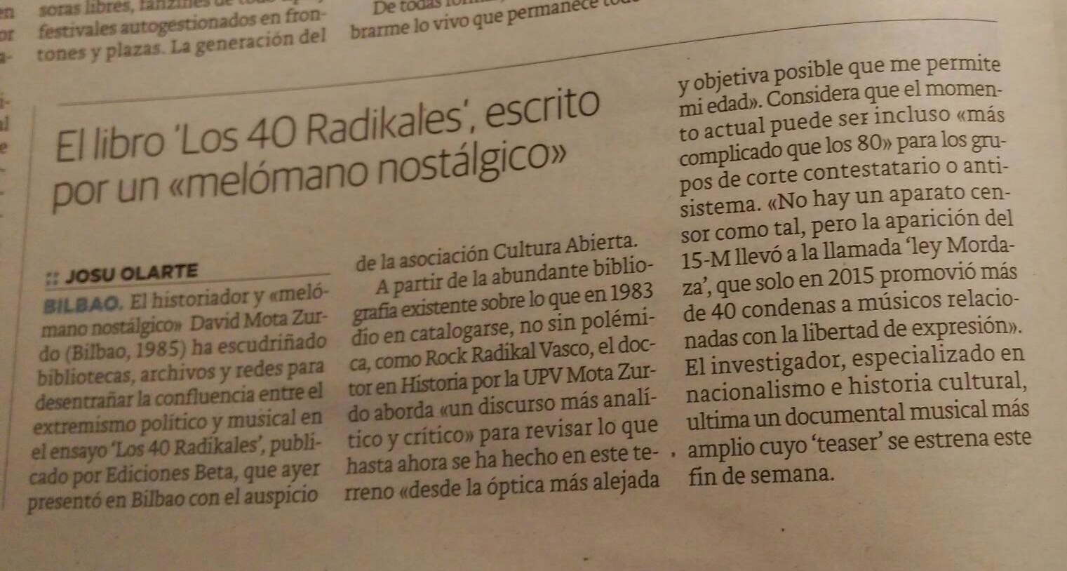 (08.01.2018) "Novedad editorial. Los 40 Radikales. la música contestataria vasca y otras escenas musicales".