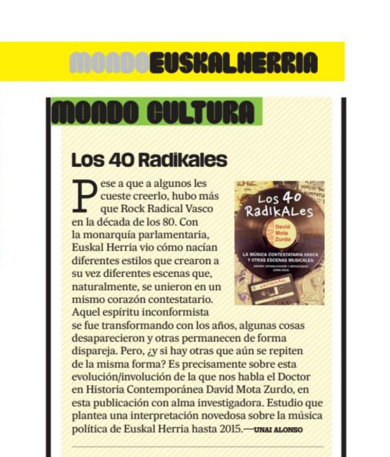 Reseña: Mota Zurdo, David (2017). Los 40 radikales. La música contestataria vasca y otras escenas musicales: origen, estabilización y dificultades (1980-2015). Ediciones Beta III Milenio. ISBN: 978-84-16809-68-4. Fernán del Val Ripollés.