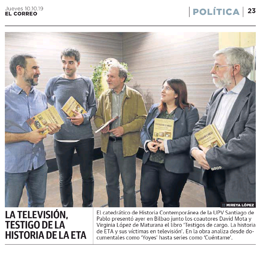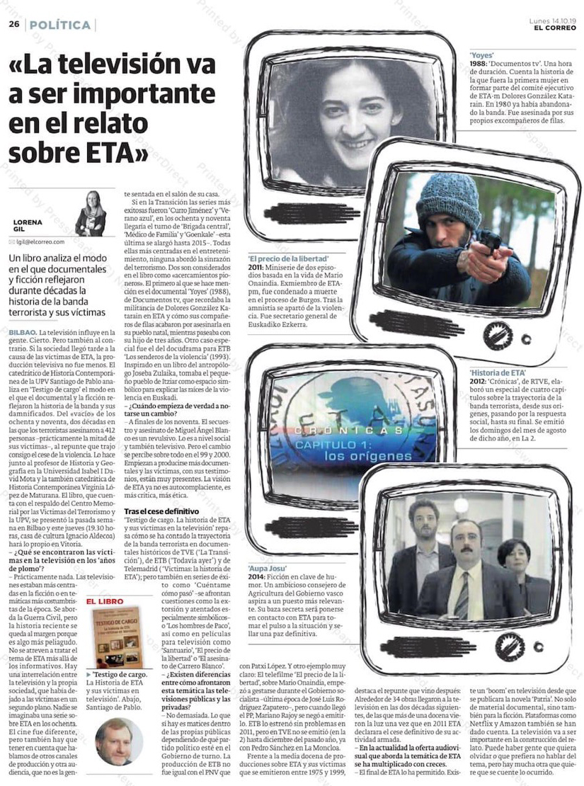 "Testigo de cargo. La historia de ETA y sus víctimas en televisión". Entrevista sobre el libro que recoge el modo en que el documental y la ficción han representado la historia de la organización terrorista y sus víctimas.