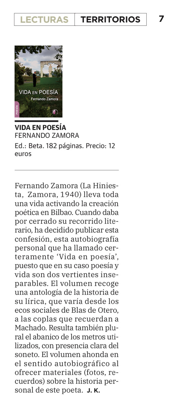 Reseña del poemario Vida en poesía de Fernando Zamora publicada en la sección Territorios de El Correo en la edición del 8 de mayo de 2021.